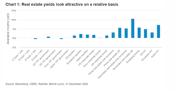 The continued monetary support for economies around the world has made bonds yielding more than one per cent ever scarcer. At the end of 2020, only 38 per cent of global A-rated financial bonds and 45 per cent of A-rated industrial bonds offered more. In contrast, yields on prime real estate assets are around 3 to 4 per cent, often with long, secure income streams from the same companies whose bonds trade well below one per cent.