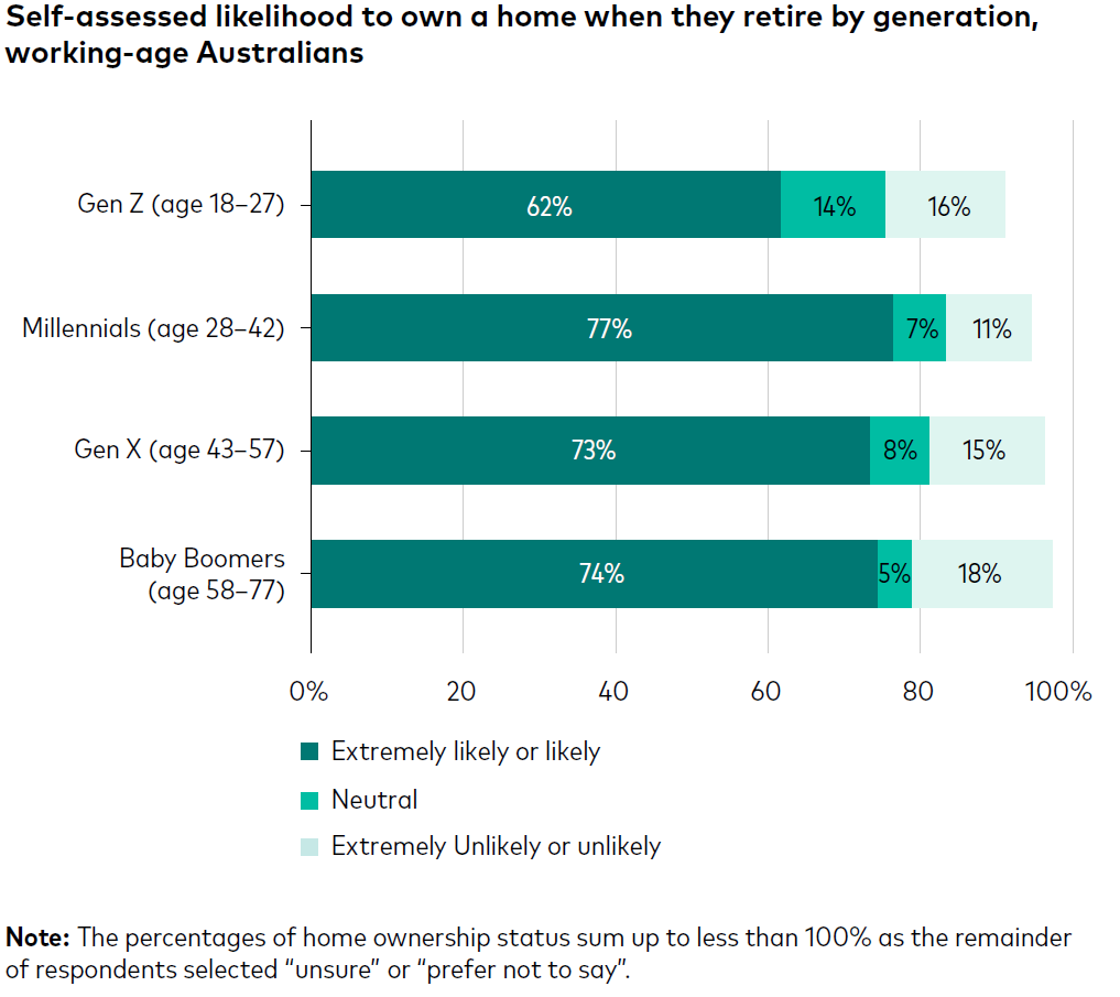 Meanwhile, 34% of working-age Australians and 41% of retirees responded that they plan to stay in their home permanently, highlighting the unique role of housing in retirement assets.