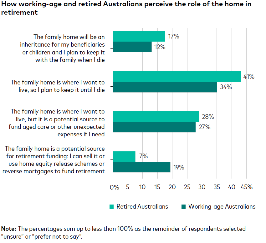 27% of working-age Australians view their family home as where they want to ultimately live, but they also believe it can potentially fund aged care or unexpected expenses if needed. 28% of retired Australians believe the same.