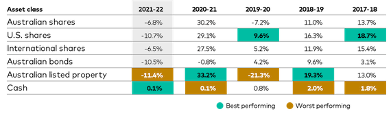 Note: Asset class percentage return calculations are based on market open levels on 1 July 2021 and closing levels on 30 June 2022 for the S&P/ASX All Ordinaries Accumulation Index. MSCI World ex-Australia Net Total Return Index. S&P 500 Total Return Index. Bloomberg AusBond Composite 0+ Yr Index. S&P/ASX 200 A-REIT Accumulation Index. Bloomberg AusBond Bank Bill Index.